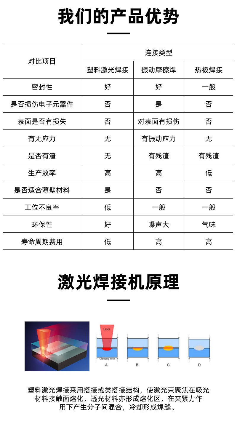 塑料作為一種常規(guī)的工業(yè)材料,廣泛應用于工業(yè)品制造的各個領域,汽車,生活品,電子零部件,醫(yī)療,航空航天,甚至軍用等,塑料的材料類型也隨著工業(yè)應用的不斷提高,在不斷的更新。對于塑料的粘合工藝來講,長時間來集中在涂膠,熱壓焊接,超聲波焊接,高頻紅外等很多成熟的工藝方式,但是隨著塑料產品工藝要求的提高,傳統(tǒng)的塑料加工方式已經出現(xiàn)明顯的不足。激光焊接在最近的工業(yè)制造應用上有明顯的優(yōu)勢。當然,激光技術的不斷提升,設備成本的不斷降低也是促使該行業(yè)進入大批量普及應用的階段。由原來的通用型機器去適配材料,進入到可以根據(jù)產品反向定制設備的階段。在目前來看,相對傳統(tǒng)工藝,激光焊接雖然優(yōu)勢明顯,但是激光焊接并不是取代,而是對傳統(tǒng)工藝的補充。激光設備的造價目前來講還處在比較高的領域,所以一般情況下,工藝要求高(傳統(tǒng)工藝無法完成)的加工應用,才會使用激光方式進行加工。下表是與常規(guī)傳統(tǒng)工藝簡易的對比資料: